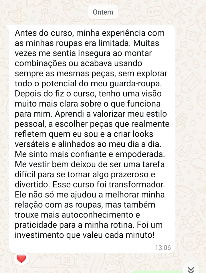 Aprenda a transformar sua imagem de forma prática e descomplicada. Com o método Estilo Autêntico, você terá acesso a aulas que unem teoria e exercícios aplicáveis ao dia a dia, ajudando você a ganhar confiança, economizar tempo e construir um guarda-roupa alinhado à sua essência e aos seus objetivos.
